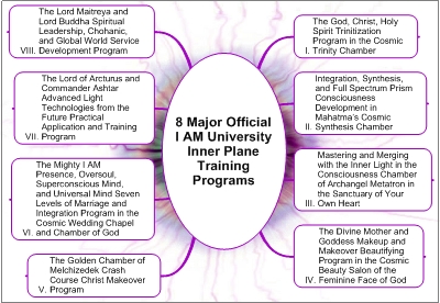 Currently, the eight major Official I AM University Correspondence Courses on the outer/Earthly plane correlate to the eight Official Inner Plane Training Programs described below. Please see “Inner/Outer Plane Training Correlation” for more information.